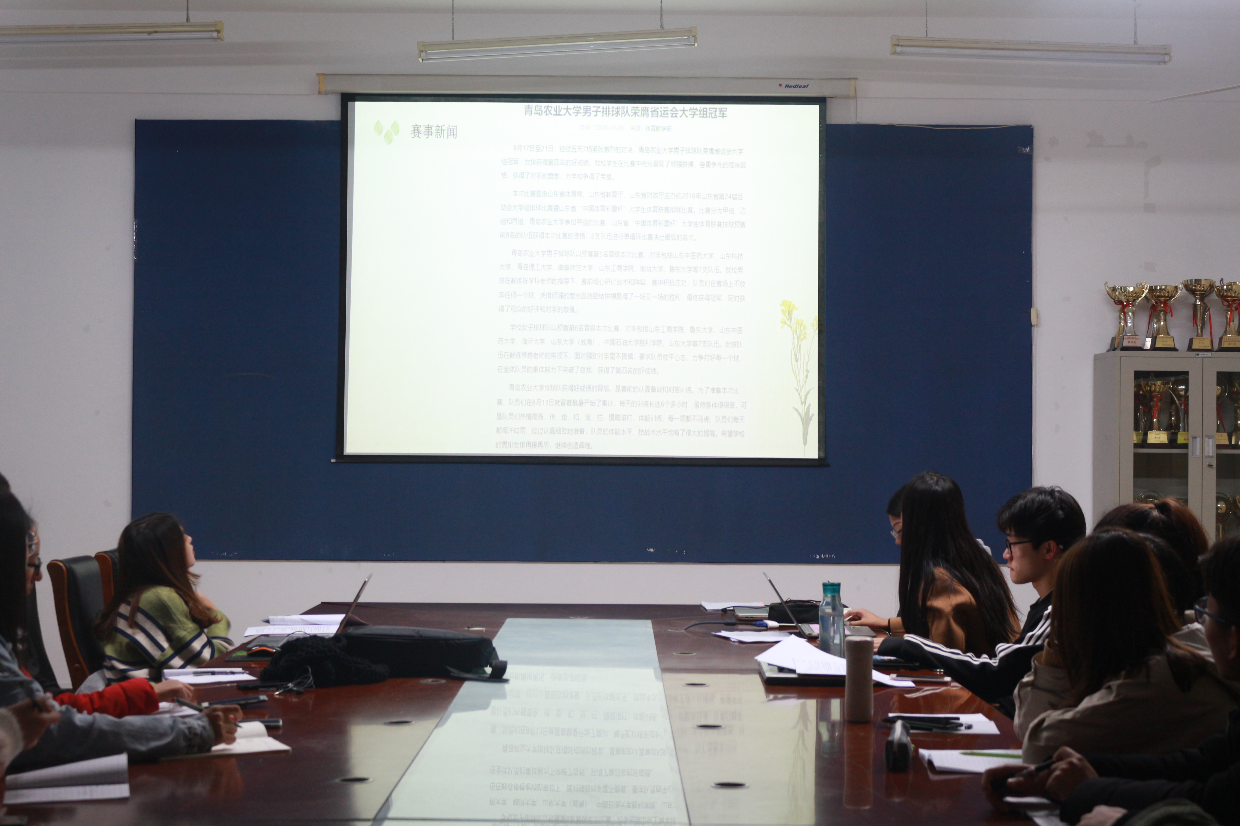 会议伊始,干事周苗苗以PPT形式向实习干事清晰条理地讲解了新闻写作的基本要求,强调稿件应具有时效性和严谨性。具体新闻例文的讲解,使得与会成员对新闻写作有了更深刻地认识。随后,干事马上原对相机的使用和新闻摄影的要求做了详细的讲解,他强调,新闻摄影应找好角度,照片的多角度拍摄利于全方位地记录活动过程。会议最后,王冠颖做出总结,希望在坐人员经过培训,能够真正掌握新闻的写作要求,一起为学院的宣传工作作出努力。