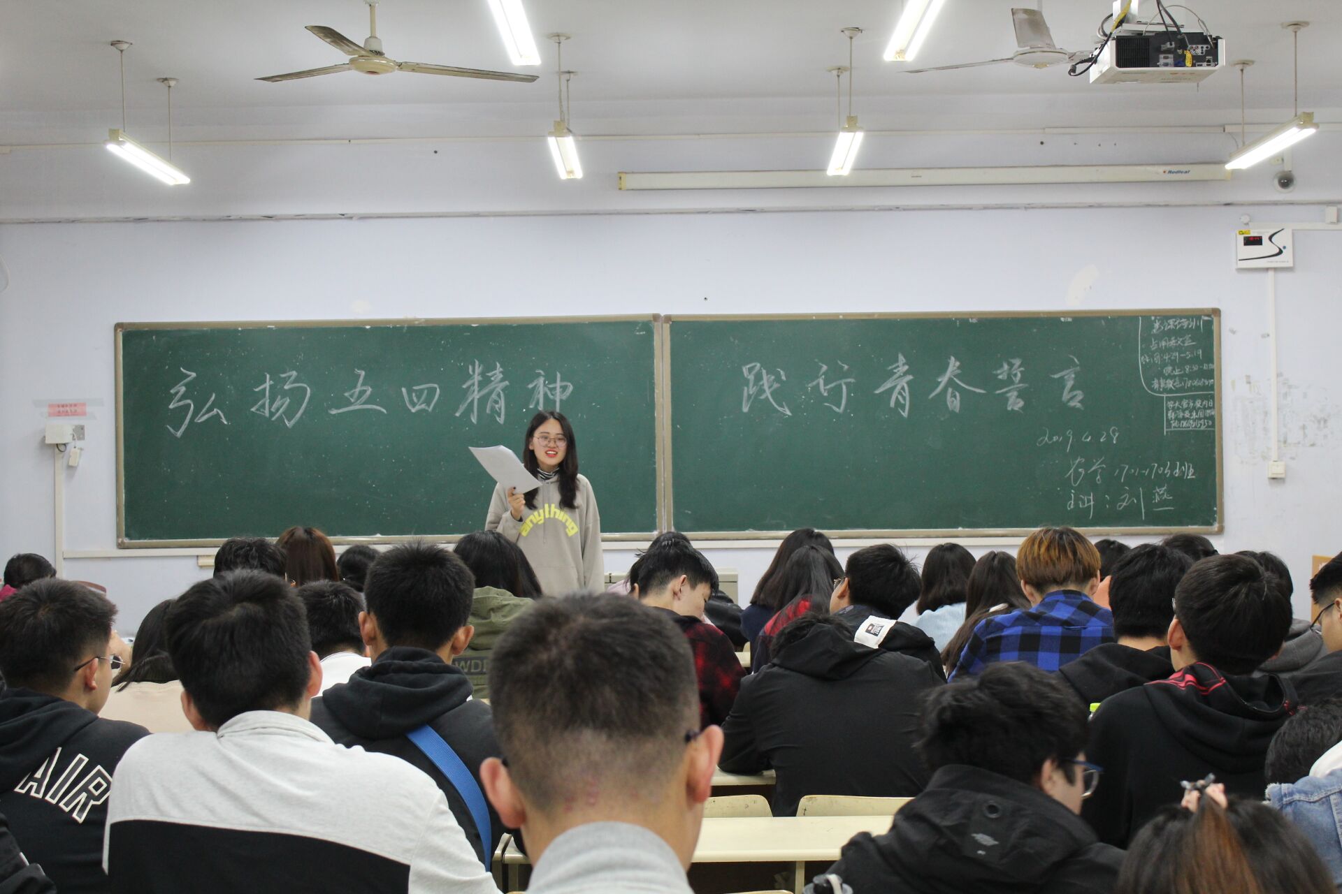 4月28日,15vip太阳成于教学区开展“弘扬五四精神,践行青春誓言”主题团课,旨在让同学们了解五四运动,弘扬五四精神。学院2017、2018级同学积极参加。