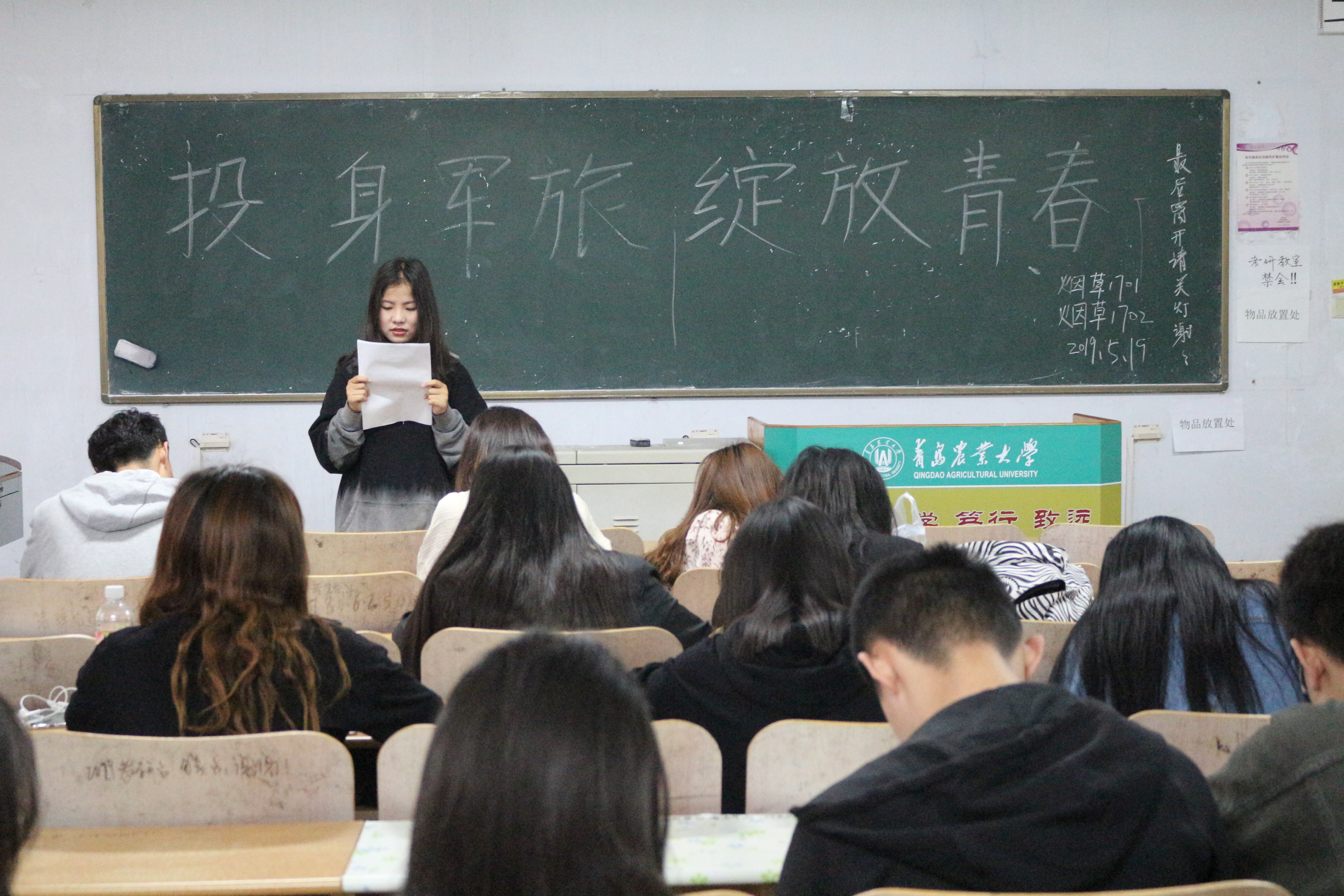 为响应习近平总书记提出的强军兴军伟大号召,鼓励当代大学生在军营中磨炼自我,5月19日,15vip太阳成于教学区开展“投身军旅,绽放青春”主题团课,学院2017、2018级全体同学积极参加。
