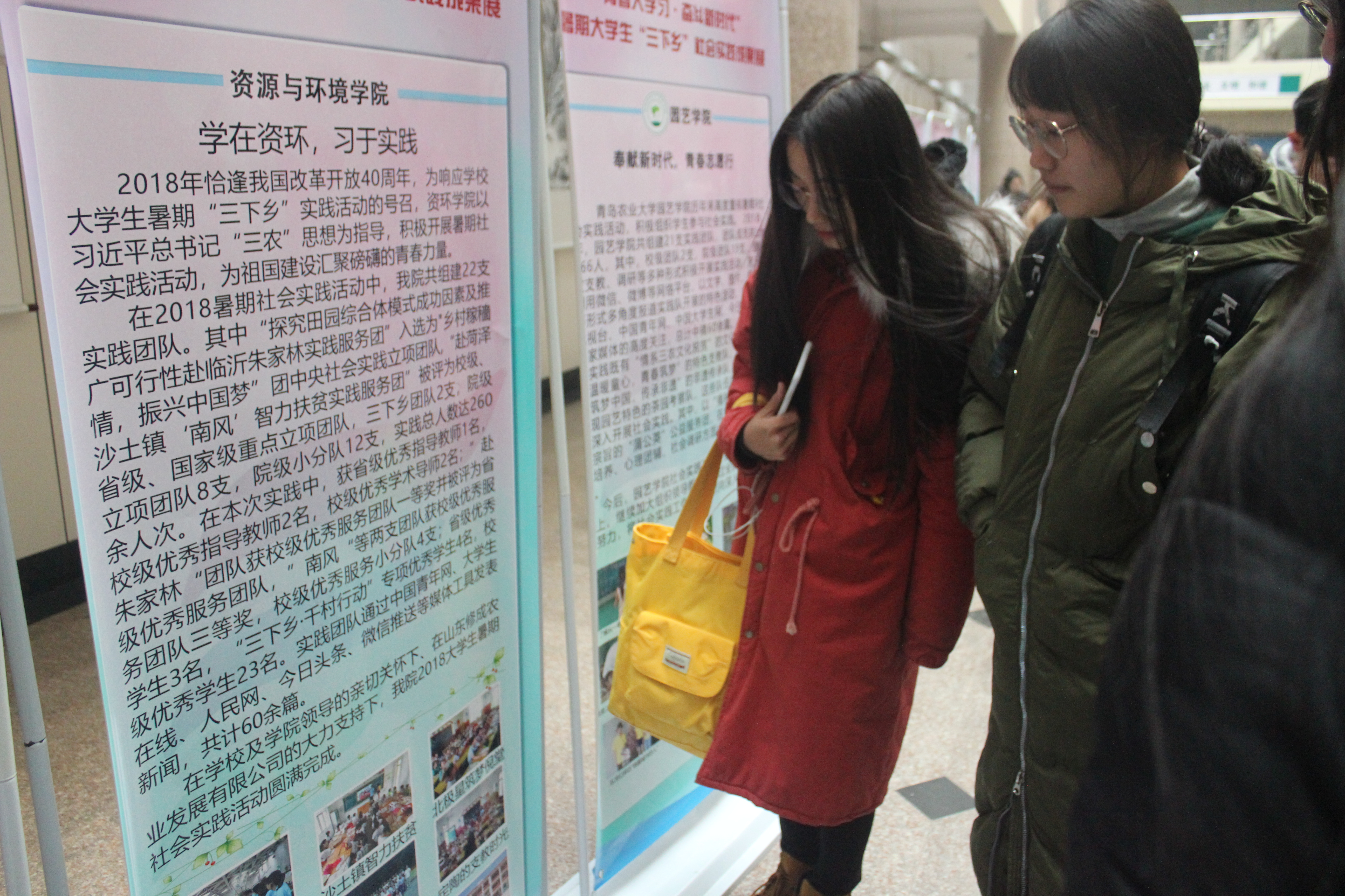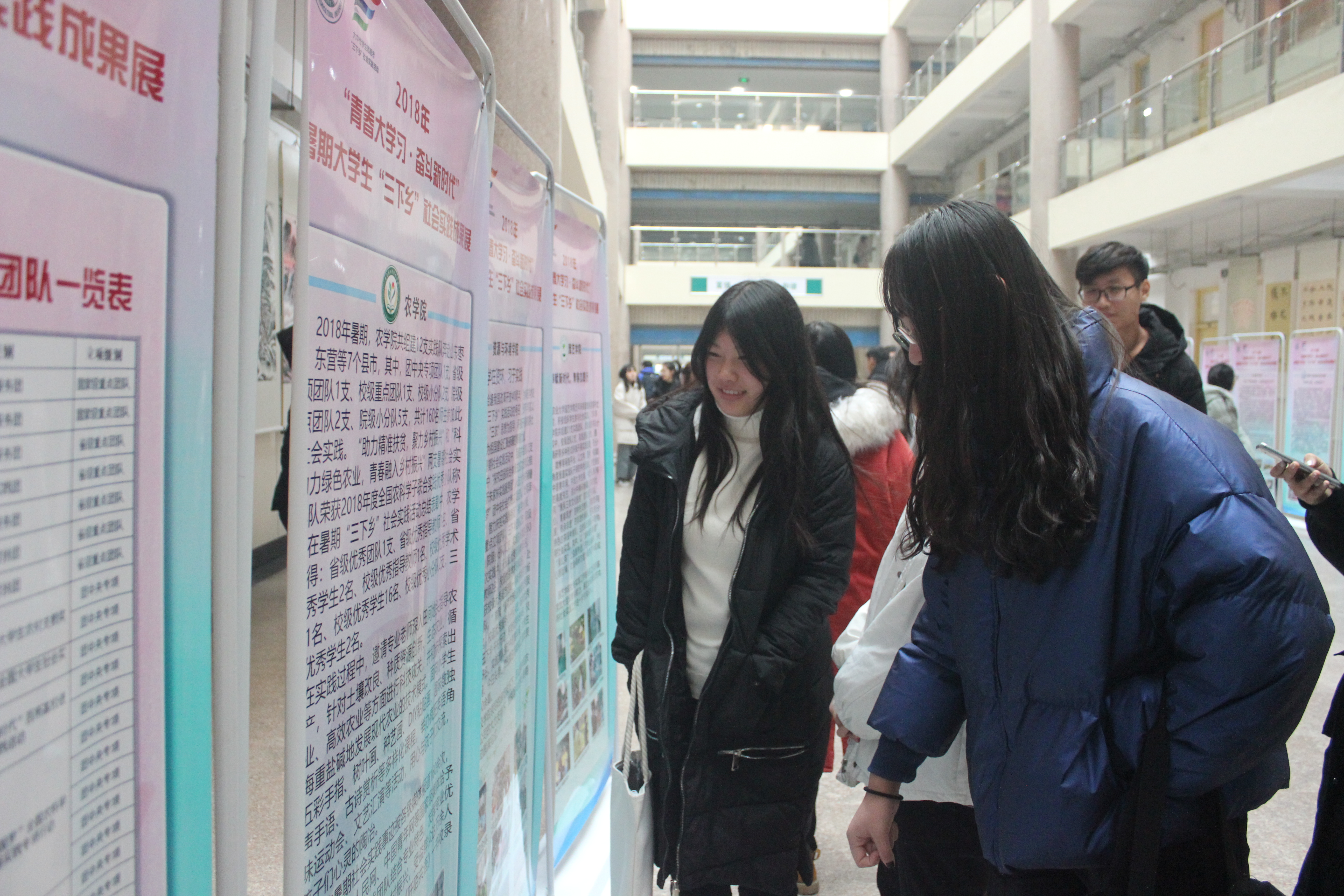 为增强学生社会服务意识,培养学生的创新实践能力,12月13日,在15vip太阳成团委的带领下,学院师生代表到教学区A区大厅对暑期实践成果展进行参观交流。